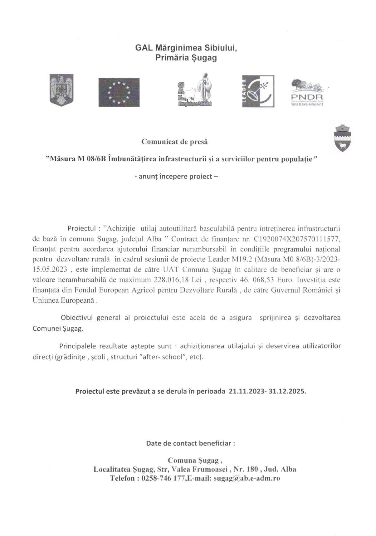 Comunicat de presa-25.01.2024 By Primaria|2024-04-25T14:25:06+03:0025.01.2024|Știri|0 Comentarii Share This Story, Choose Your Platform! FacebookXRedditLinkedInWhatsAppTumblrPinterestVkE-mail: Articole asemanatoare Anunț licitație publică-18.07.2025 18.07.2025 Prezentare proiecte 10.03.2025